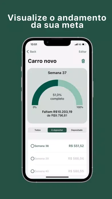 Os dois irão poupar uma quantia semanalmente, até 52 semanas passarem. Essa quantia aumenta progressivamente, ou seja, caso o usuário comece poupando 5 reais, no final de 52 semanas terá 1755 reais guardado.