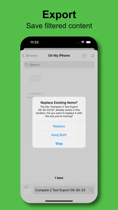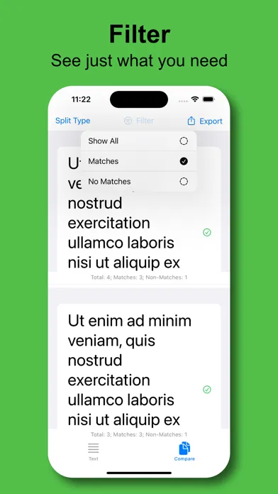 Using 'Compare 2 Text' you'll be able to automatically compare two bodies of text together and see comparison results with ease. Comparisons occur both directions, so you can see differences between the two bodies of text. Compare 2 Text is a fast and reliable app to show automatic comparison results for paragraphs of text. Compare 2 Text has easy to understand visuals that are colored in vibrant colors. Powerful filtering functions give you unparalleled capability to see fast text matching results. Additionally, a simplistic export solution gives users excellent exportation to text content.