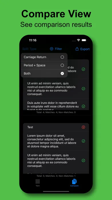 4.) Click "Compare" to see text comparison results, separated by selected Split Type in a List View format.