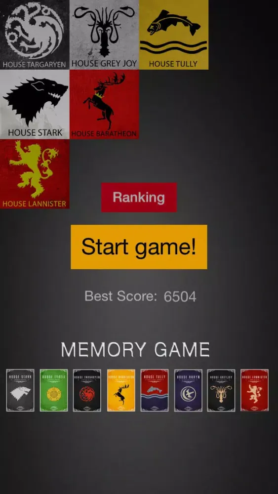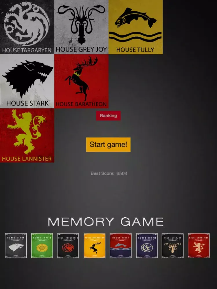 How quickly can you match the symbols of the Great Houses of Westeros? Exercise your brain & compete with players all over the world in this Game Center enabled Game Of Thrones inspired memory game!