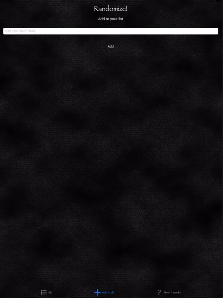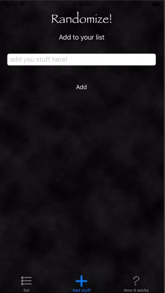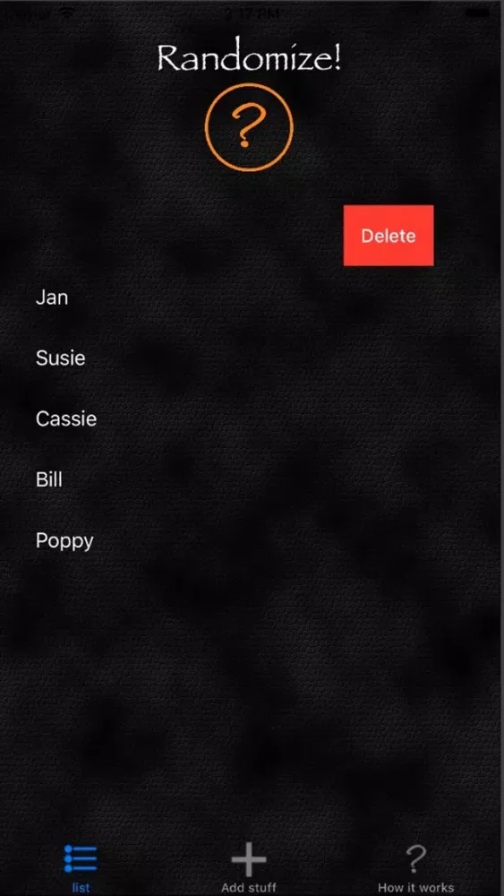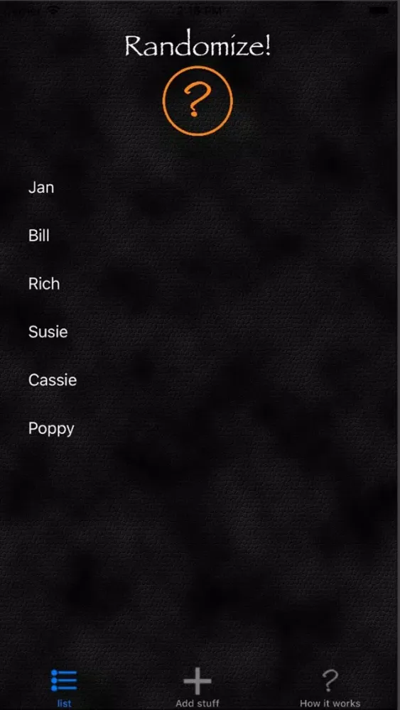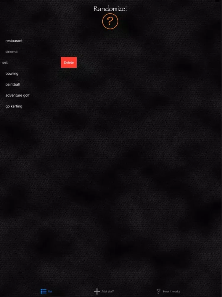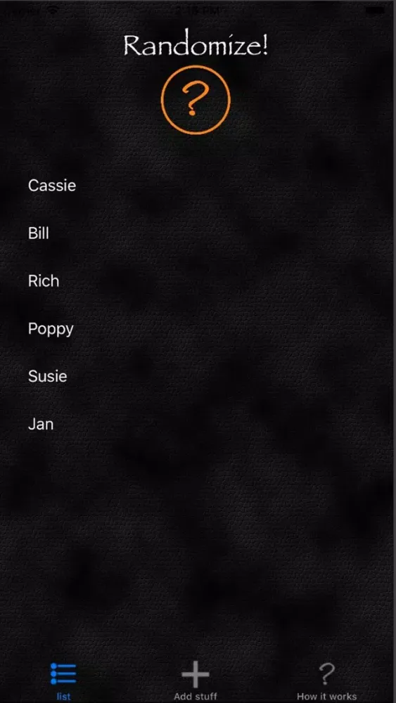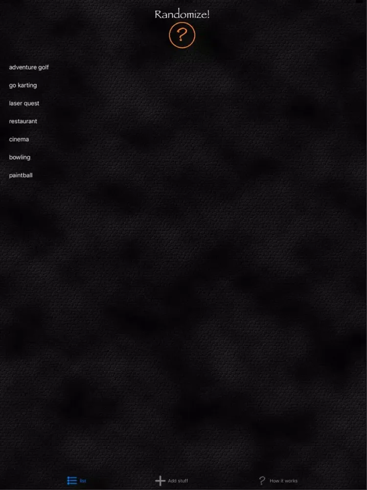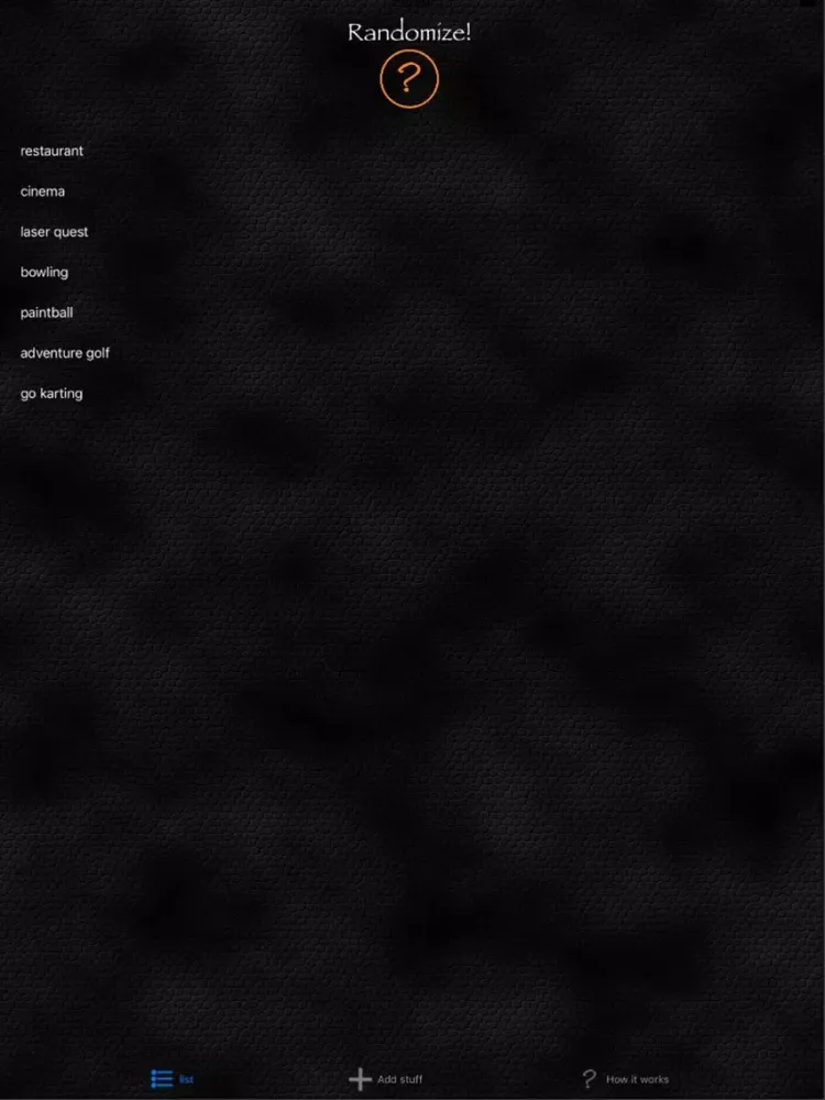 Think 'Names out of a hat', Randomize allows you to add details and then randomly list them. Can't decide what order to play a game in, or what team your on? add everyones name and then hit the orange question mark. Can't decide which restaurant to go to? add the names of your favourites to the list and hit the orange button use the top one.