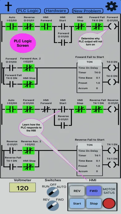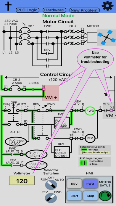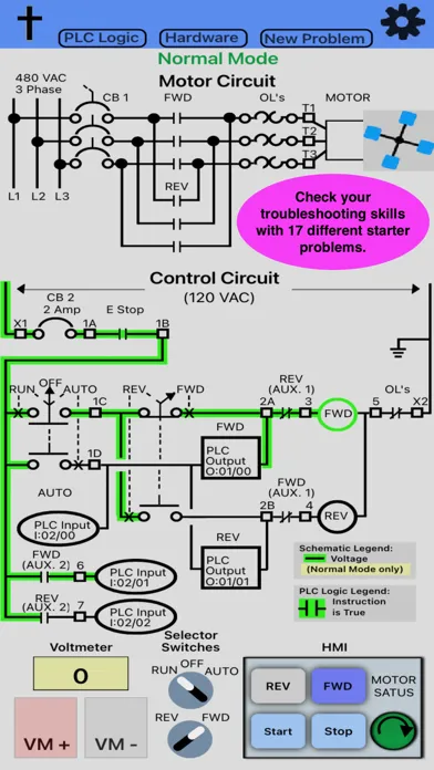 After the user understands how the motor starter works in the various control modes, the user can test their troubleshooting skills by touching the "New Problem" button and placing the app into troubleshooting mode. A random problem will be introduced into the control circuit and the user will need to check, if the motor will run with the selector switch in both "RUN" and "AUTO", Use the voltmeter probes and PLC logic screen to identify the problem. Once the user believes they have identified the problem, touch "Problem Identified". If the user cannot determine the problem, at the bottom of the list there is an item to provide the answer to the user.