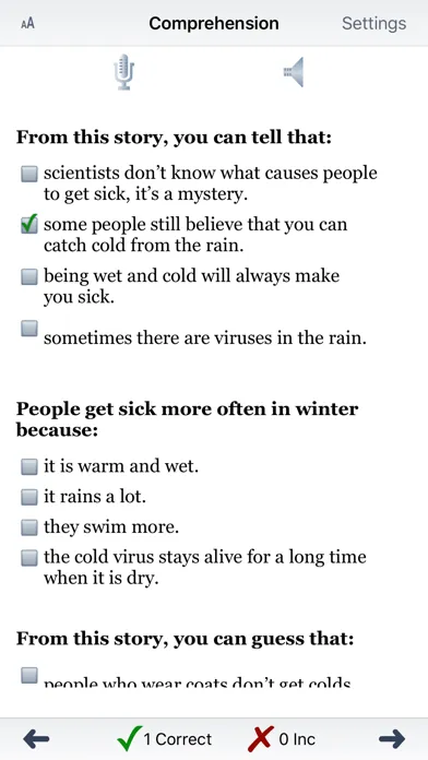 Often the student gets a question wrong because they focus on a detail of the story. Sometimes they recognize words or numbers in the answers and choose an answer because the words are familiar. The popup explains why incorrect answers may appear to be correct. It also explains why the correct answer is, in fact, the right choice. After the student studies the explanation, they should read the question again and answer it using the knowledge gained from the explanation. If they want, the student can swipe back to the story and look for the answer in the story. An option lets the student choose to see the explanations after each answer is selected, rather than just after incorrect answers.
