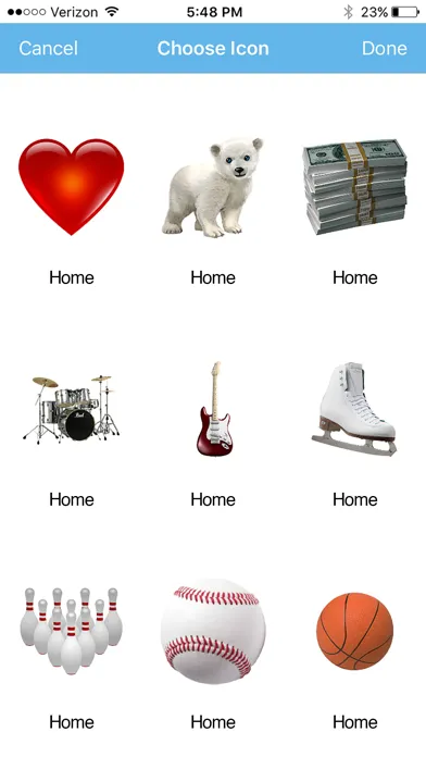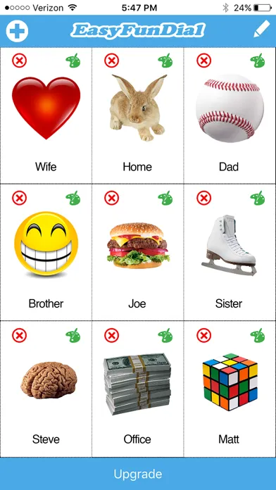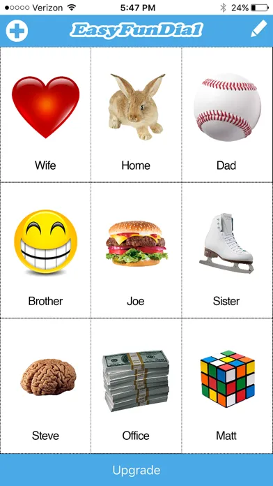 EasyFunDial is fun to create and use, testing your imagination and creativity. Choose images for each of your contacts from our library in a variety of categories, including animals, arts, bar & casino, footwear, emoticons, foods, hobbies, love, music, sports, transportation and more. So let your imagination run wild as you associate a unique image with each of your contacts. Scroll down to see some examples below.