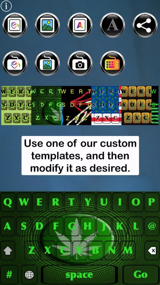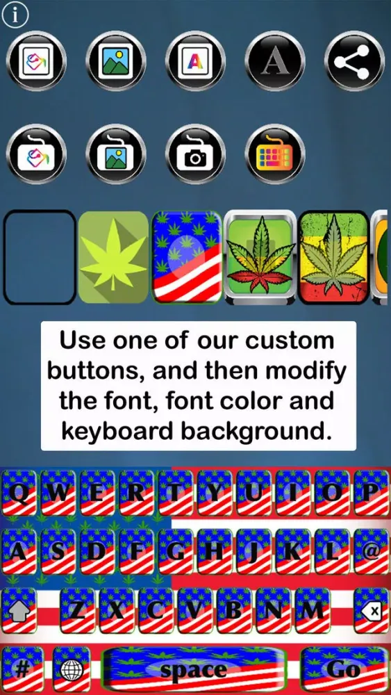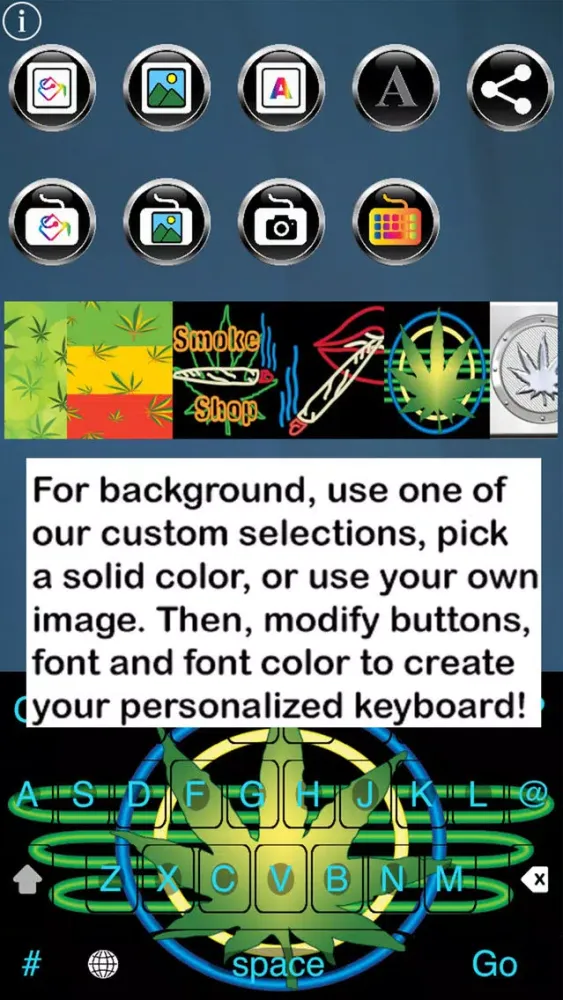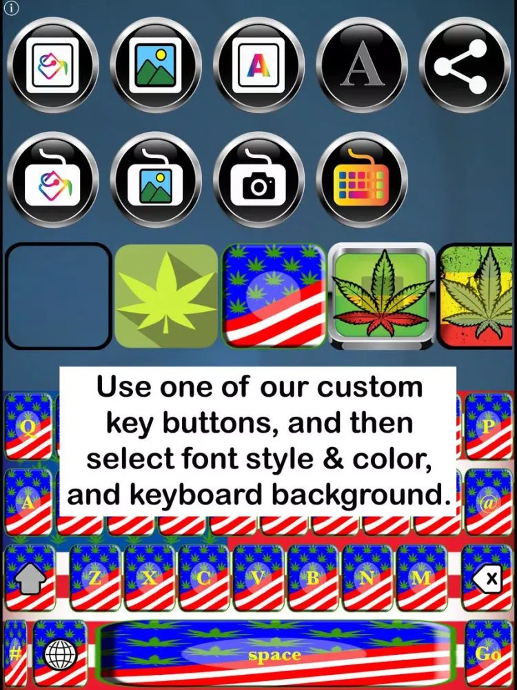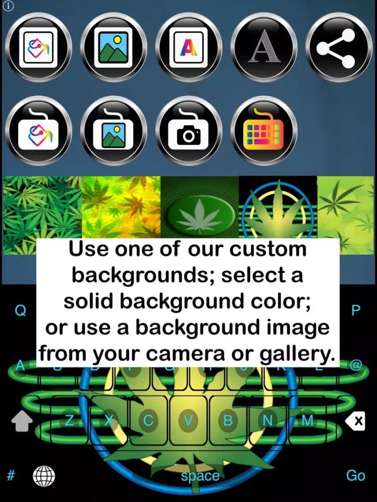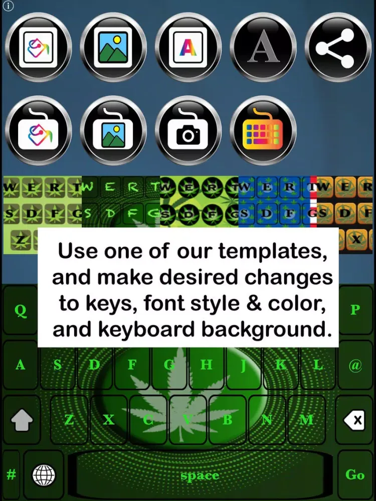 Calling all Pot and Hemp Fans - This app is for you! Pot Keys Free Custom Keyboard enables you to customize your iOS keyboard, using our pot/hemp-themed custom keys, backgrounds and templates. Modify our templates by changing key colors, font styles and colors, and background colors, or upload a background image from your device's camera or gallery.