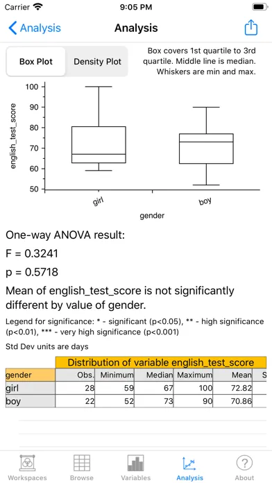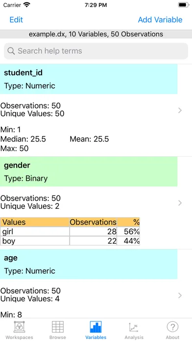 • Email PDFs and CSVs of variable summaries and analysis results