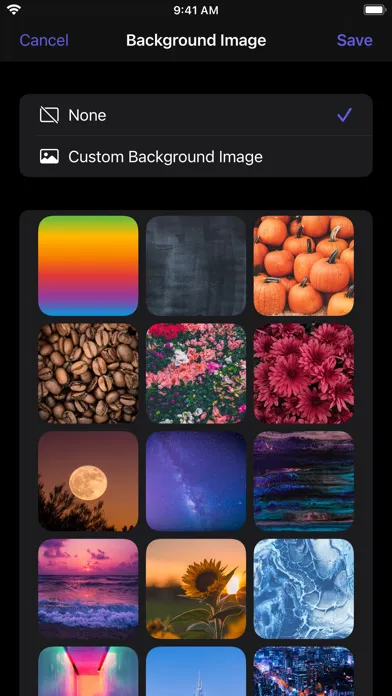 Unlock the ability to add background images with a small one-time purchase, then choose from among 30 included backgrounds or select an image from your photo library.