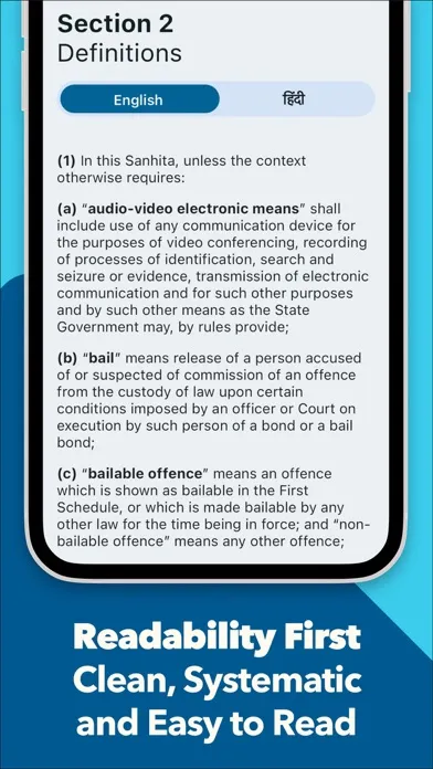 Experience the full text of Bharatiya Nagarik Suraksha Sanhita (BNSS) in both English and Hindi (भारतीय नागरिक सुरक्षा संहिता). Our app offers the 'bare act' versions in both languages, catering to a diverse user base.