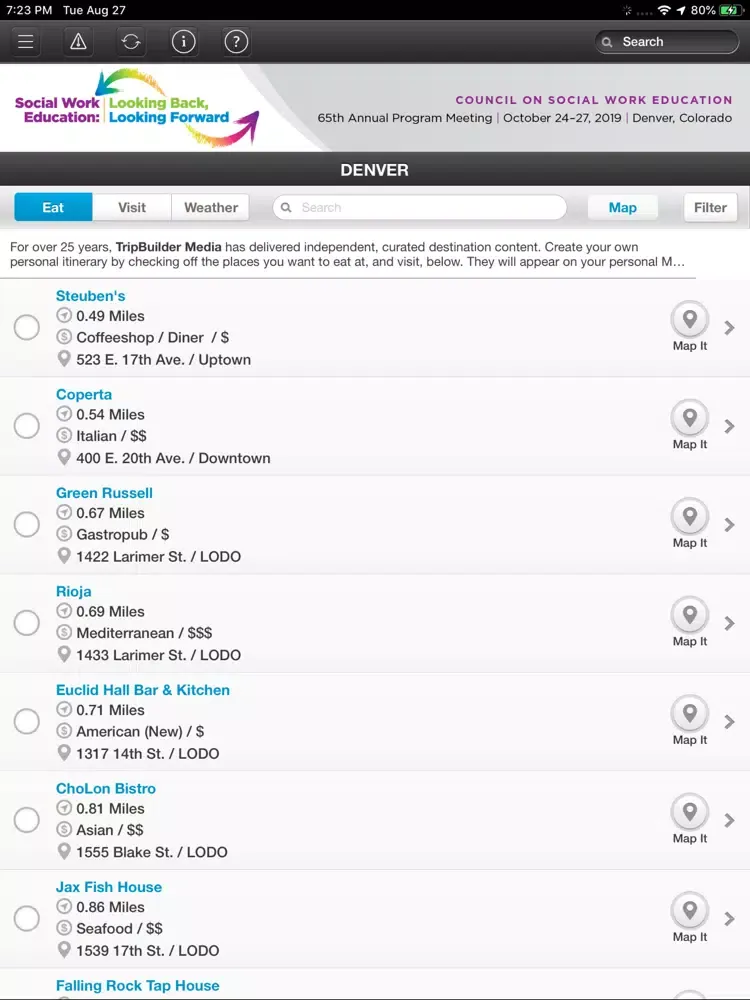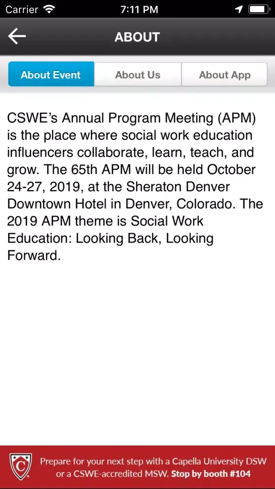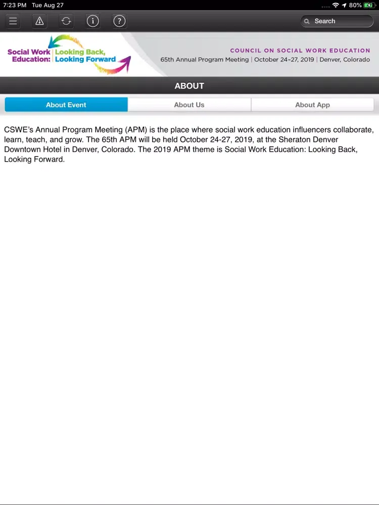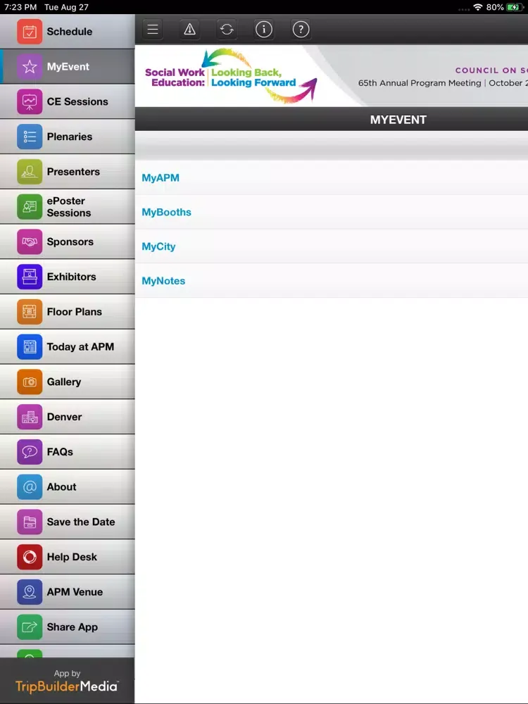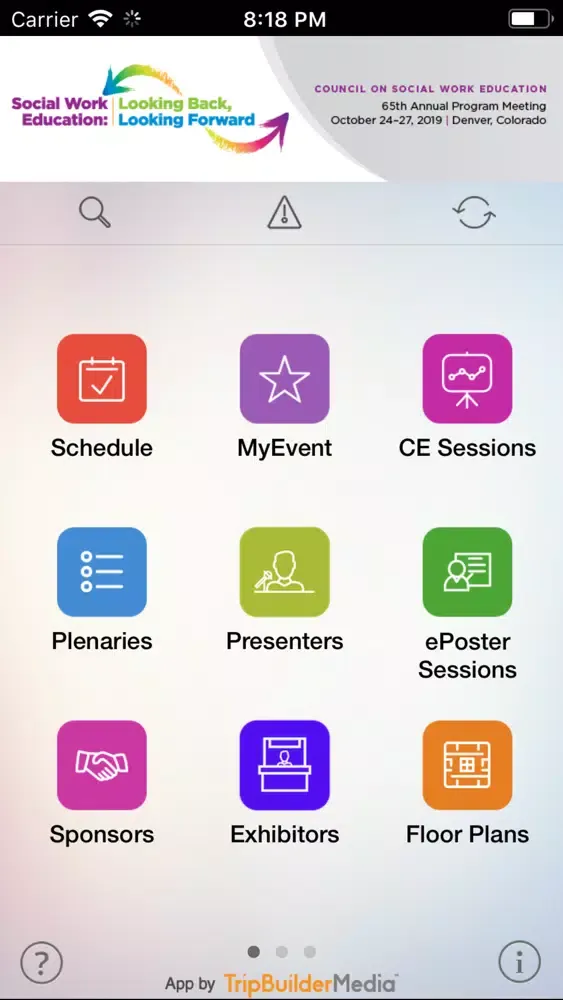 This TripBuilder EventMobile app is provided at no charge by the Council on Social Work Education (CSWE). It was designed and developed by TripBuilder Media Inc. If you have any questions, or need any support regarding how to use this app, please submit a Support Ticket (located within the Help icon in the app).