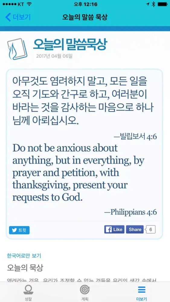O 이 앱의 더보기 탭에 있는 '오늘의 말씀묵상'은 매일 바뀝니다. 이 말씀을 시간 날때마다 읽으며 주님의 현존을 의식하며 묵상합니다.