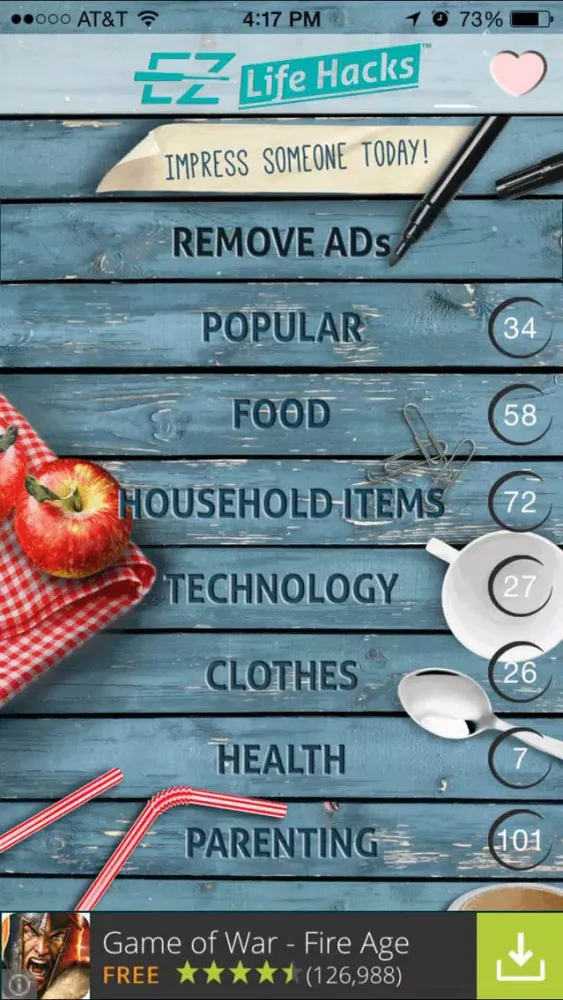 A collection of life hacks by categories such as Food, Technology, Parenting, Household Items, Clothes, Health and more!