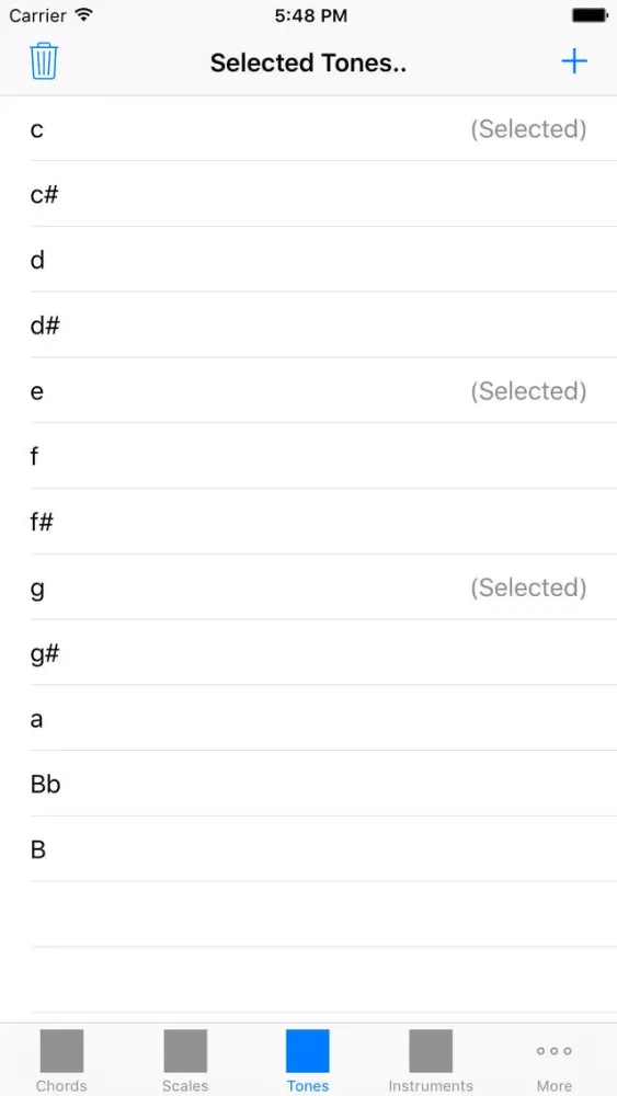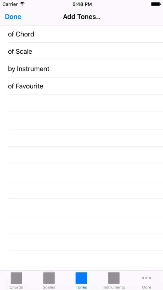 The set of tones is defined by adding chords, scales, single tones or by tapping on one of the following instruments and tunings: