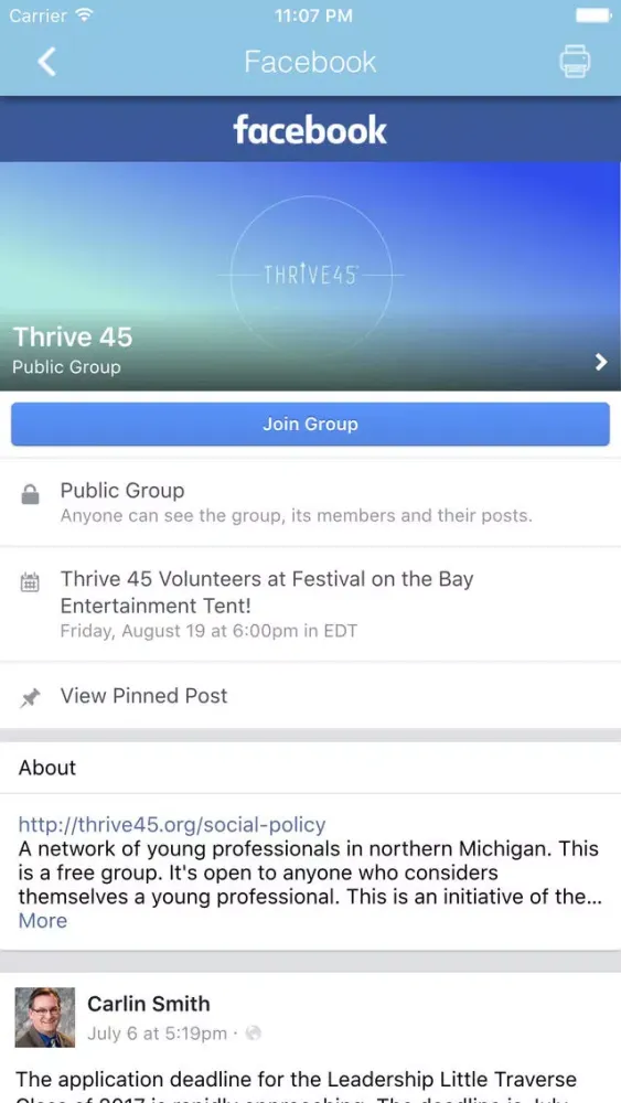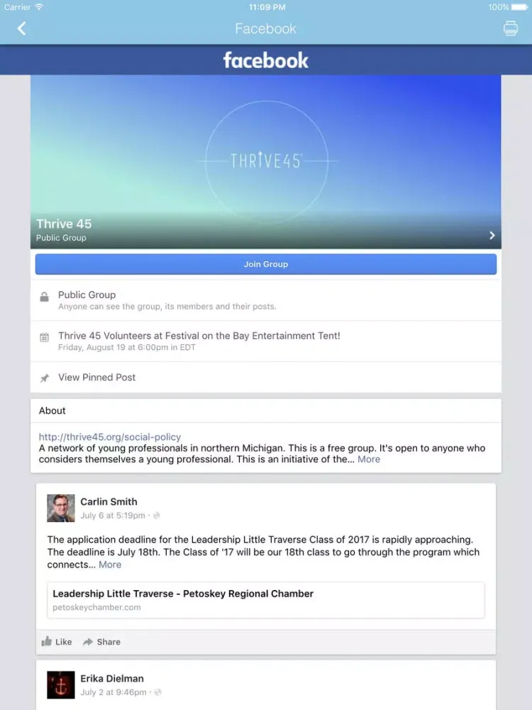 Our Thrive 45 Facebook page is active and a good place to keep in touch with the group. 45 degrees is the latitude halfway between the equator and North Pole - it's also the informal southern border of northern Michigan.