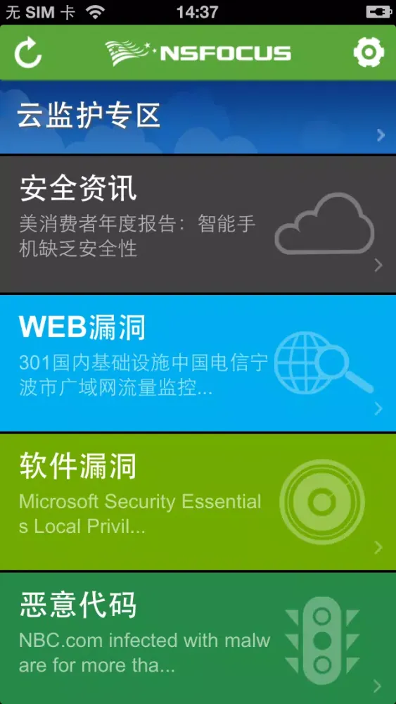 Security Cloud Center (SCC) is mobile terminal software launched by NSFOCUS. The SCC provides you the capabilities of accessing global security trends and receiving threat alerts in a timely manner, enabling you to take immediate measures to ensure network and information security.