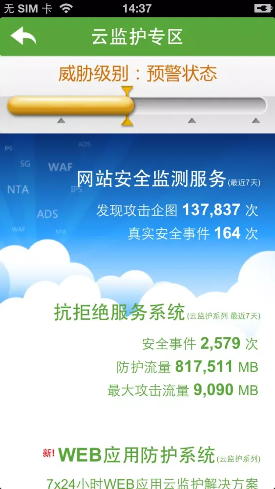 The cloud monitoring area presents the current security threat level of your environment, as well as an overview of DDoS attacks and web application attacks that are detected by NSFOCUS nationwide. In this way, the cloud monitoring area helps you learn the information security conditions in your environment as well as the trend of domestic web security threats.