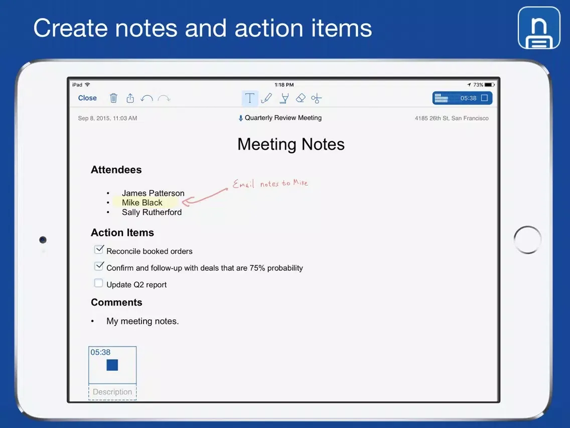 STAY FOCUSED, GET WORK DONE. Notate helps you get organized and stay productive. Start by capturing all your important information. With Notate you can quickly create typed or handwritten notes and tasks, edit notes with a rich text editor, take pictures, easily insert images, and attach audio recordings to individual notes.