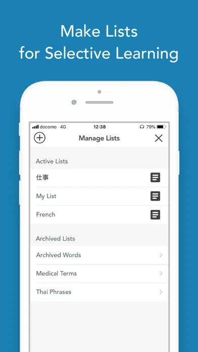 Capture and organize the words in your life into lists such as work-related (Work), class-related (Biology/Economics/etc.), or travel-related (Thai Phrases). Make lists active for testing, or archive them for later.