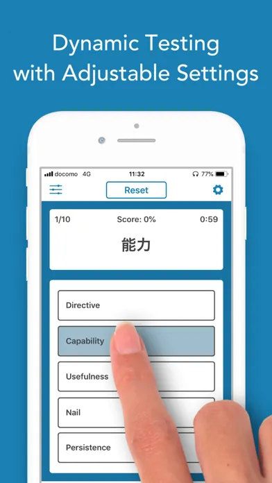 Test with varying time limits, number of questions per session, reverse questioning, and hiding or displaying supplemental subtexts for additional review. Each test delivers randomized word entry questions. Apply your own spaced repetition learning by revisiting tests at later intervals.