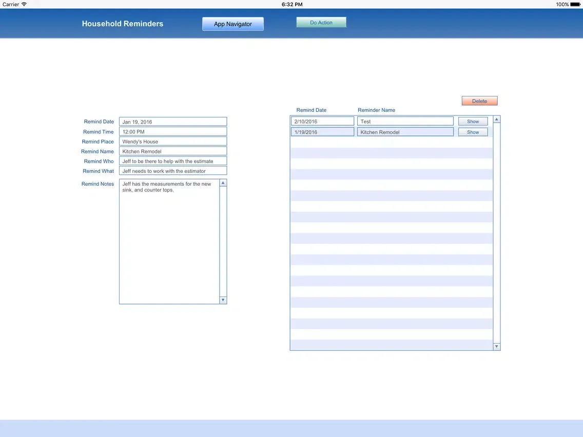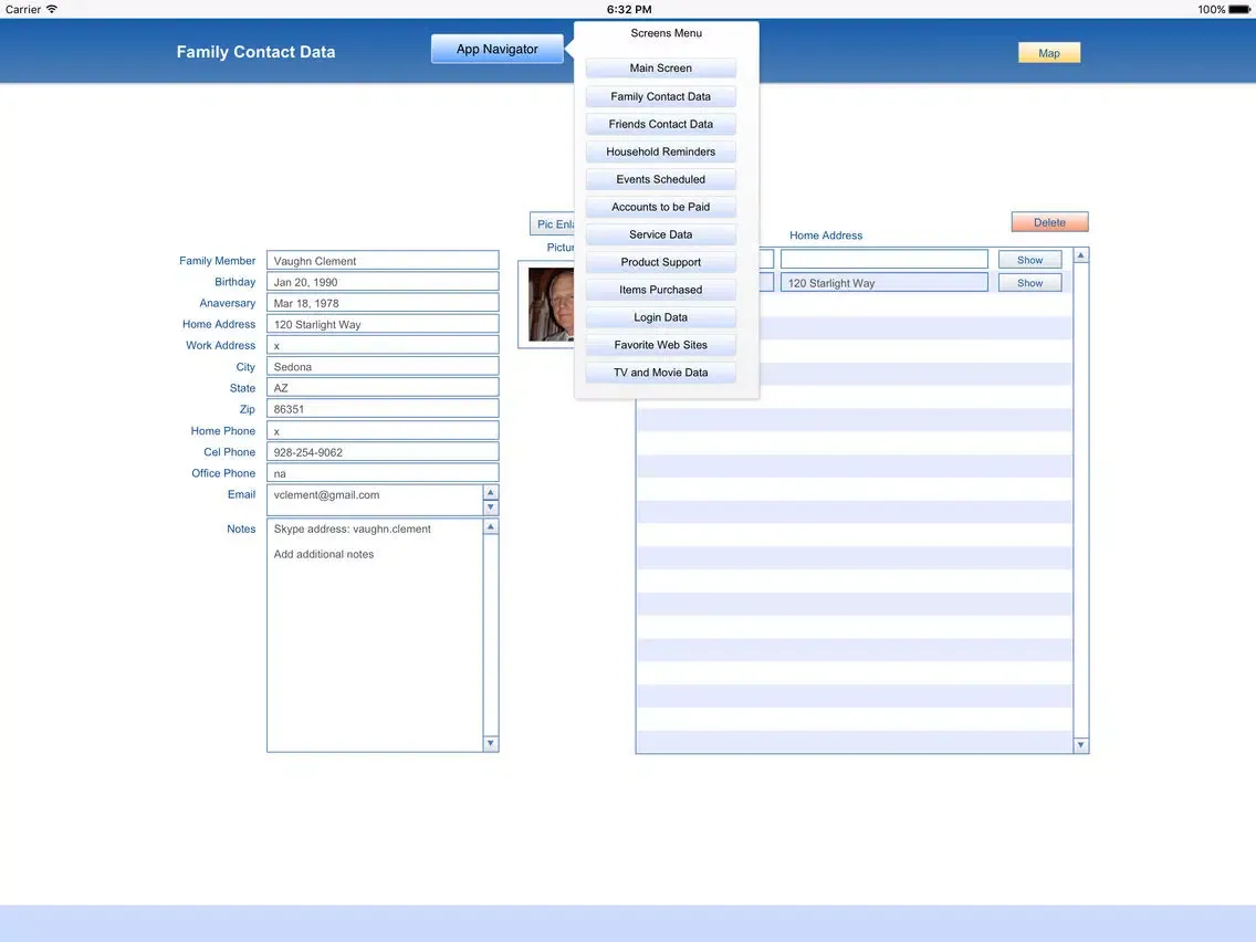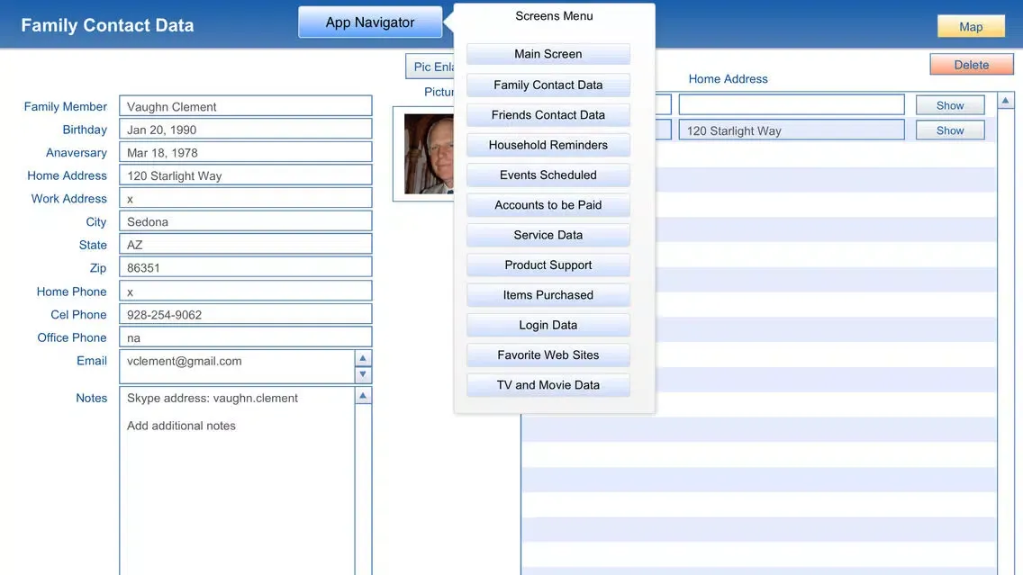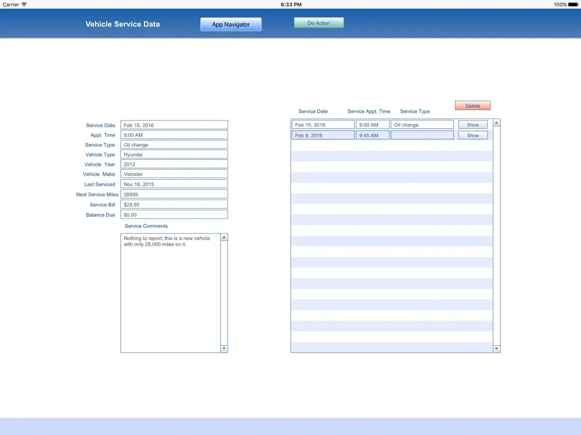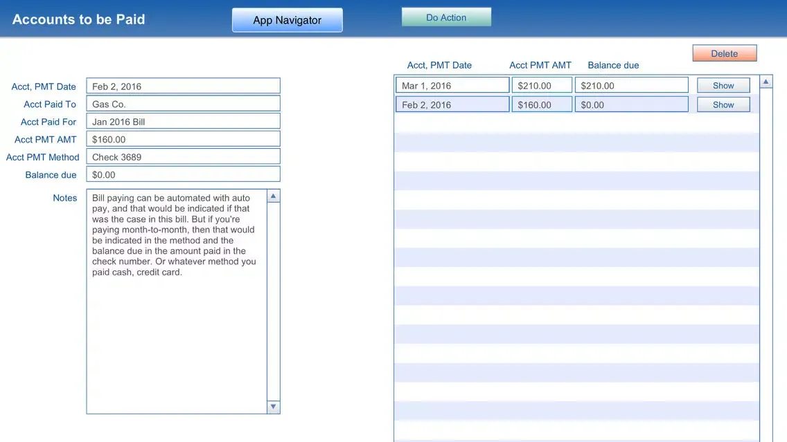 The screens are designed nearly identically to make data input simple. Each screen has a scrolling list that allows you to select any record in the scrolling list to view it. The application has a drop-down menu that allows you to access any screen in the application and one tap. There is a drop-down list named the due action button that allows you to do actions on each screen like, doing a find, navigating between records, adding new records, exercises development support, a button for viewing YouTube videos for screen help called video help.