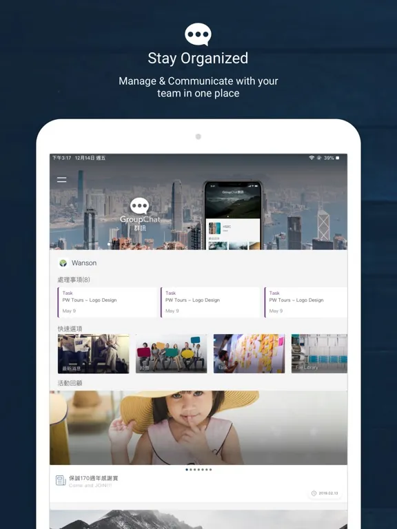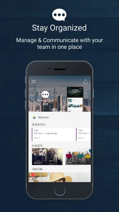 GroupChat is a mobile solution that helps managing personal performance and team internal affairs. The system provides performance management, trip log, instant messaging, event management, voting conference and document management services. With GroupChat, team operations and communication between members are facilitated, and thus achieve better performance.