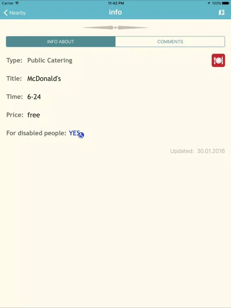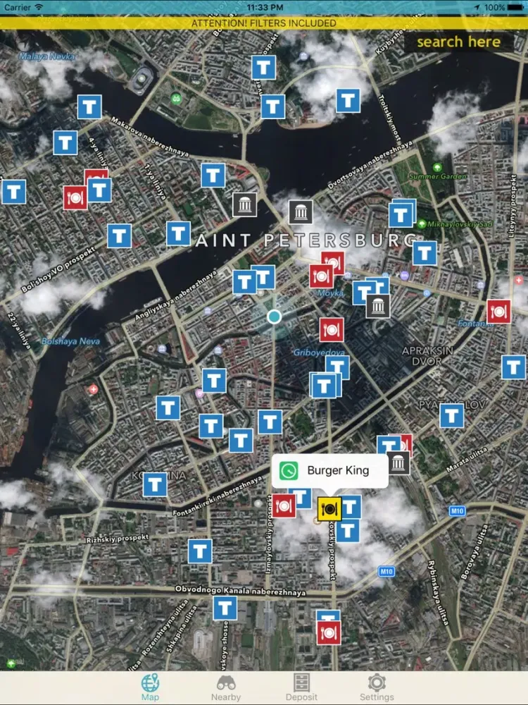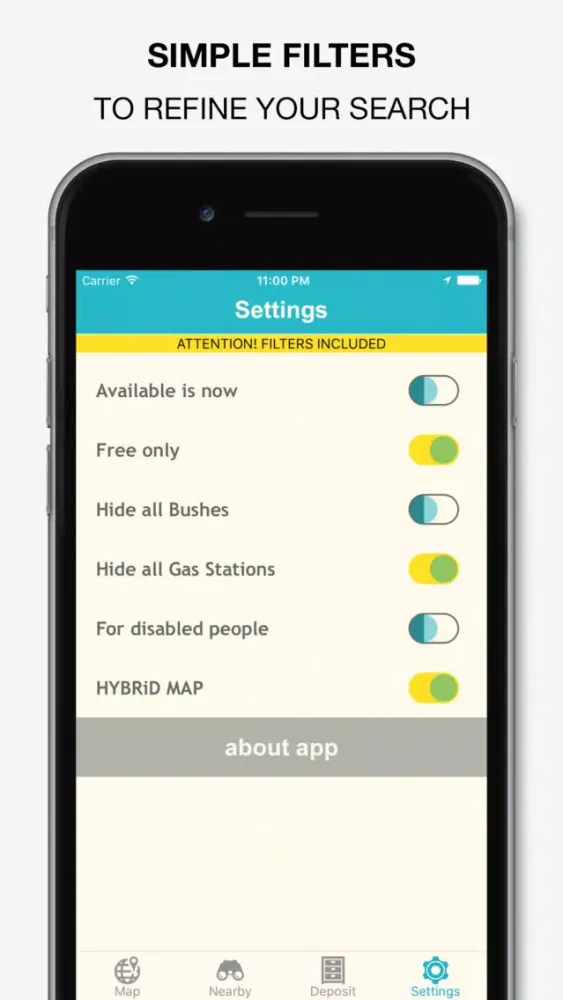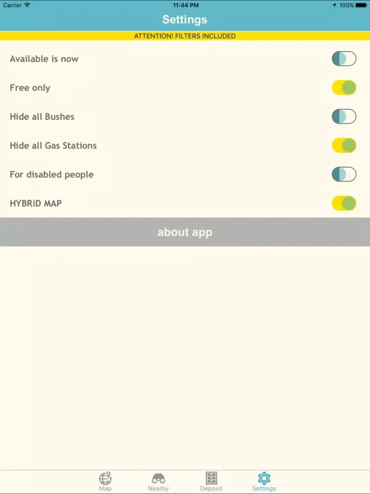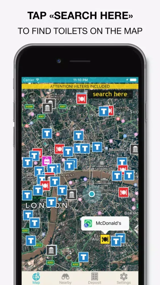 – Tap the button «search here» to find a places on the Map where there is a public toilet.