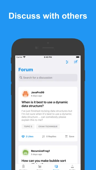 - Forum where you can discuss difficult topics and ask question relating to the course