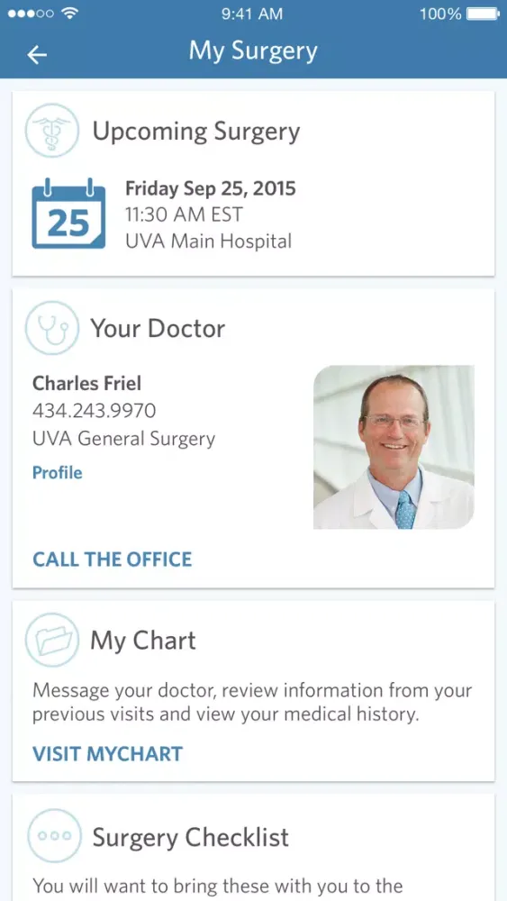UVA Health System reserves the right to modify the app or terminate access to it at any time and for any reason. UVA does not warrant that the functions or information contained in, or application services performed or provided by, the App will meet your requirements, that the operation of the application or application services will be uninterrupted or error-free, or that defects in the application or application services will be corrected.