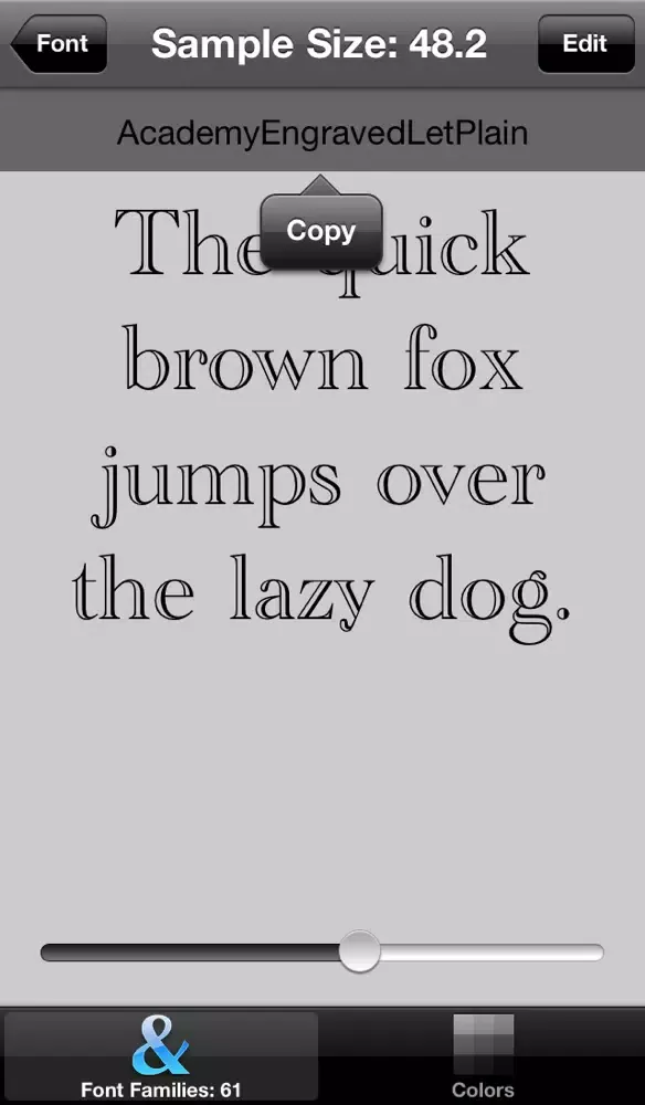 For example, you want to use the font Bodoni but have no idea whether it's available. View the fonts list. Dev Helper shows the user what what it looks like and the fonts formal name. You can even copy the current values to the pasteboard to paste directly into your code.