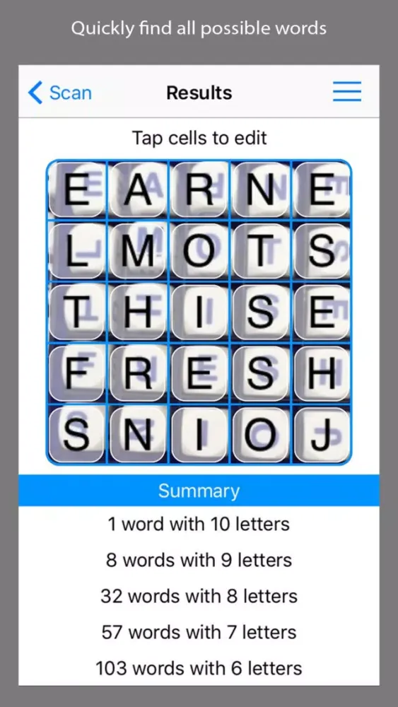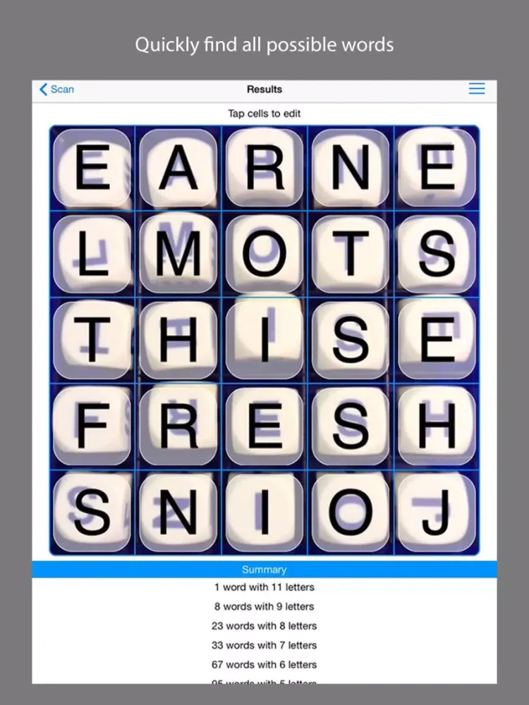 This app is the perfect utility for word-game enthusiasts who want to check for missed words or see how hard a board is before playing. Once a board is scanned, view a summary of all possible words in the board or search for a specific word. English, French, German, and Spanish dictionaries are available.
