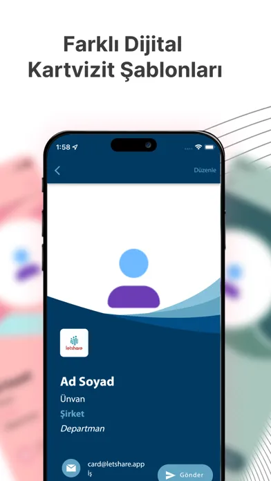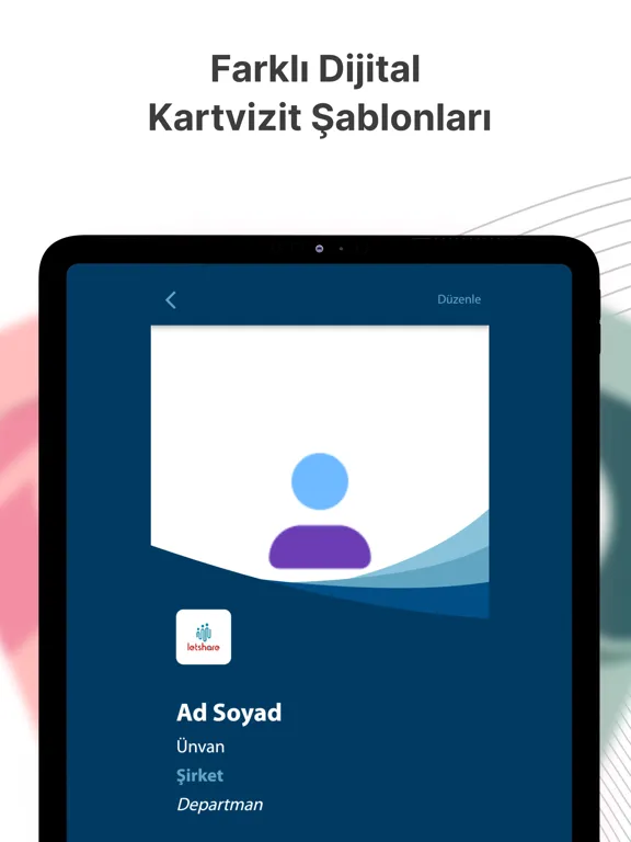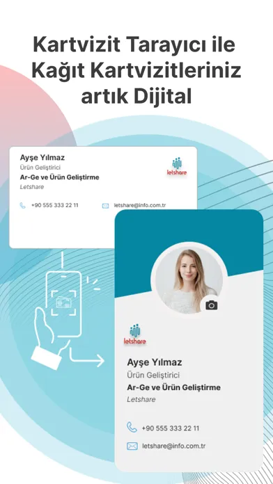 Letshare, a digital business card application, is the most technological, easy and modern way to share your contact information. After you download the Letshare application from any iOS device and register, you can create your free digital business card and start using it.You can create multiple digital business cards for your friends or customers where you share different information.