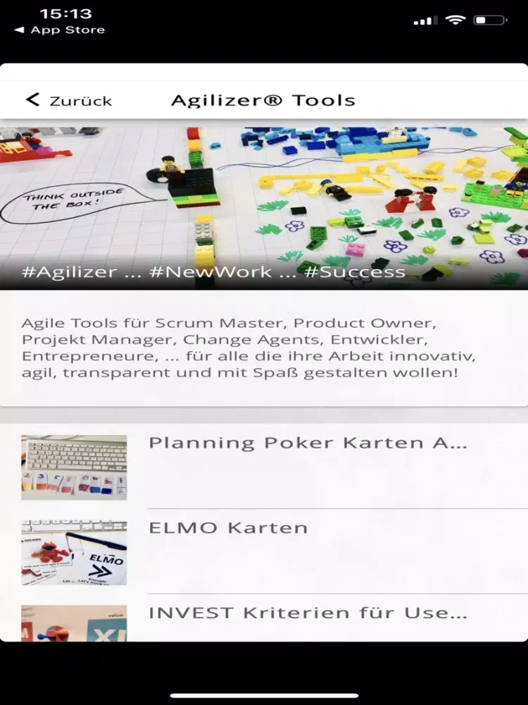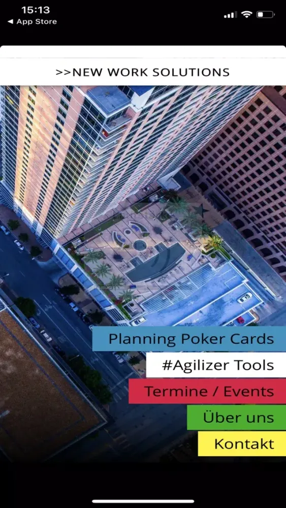The planning poker app offers agile tools like planning poker cards as well as information around the New Work Solutions company.