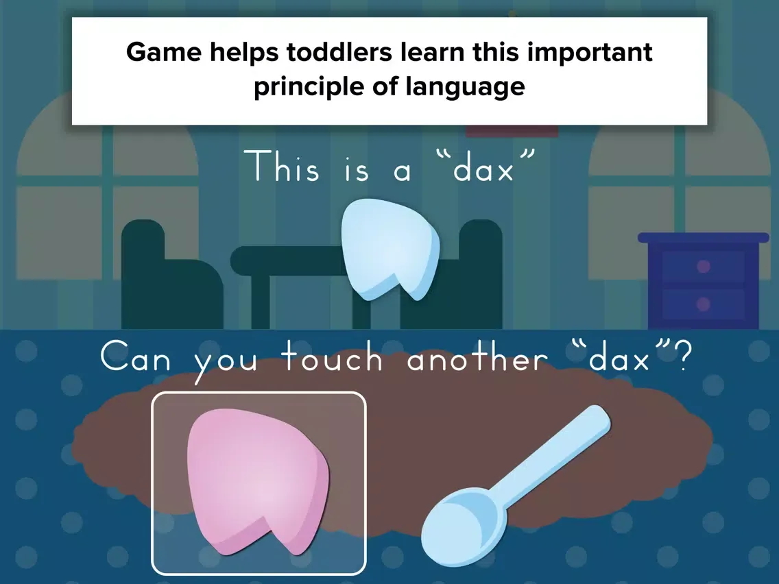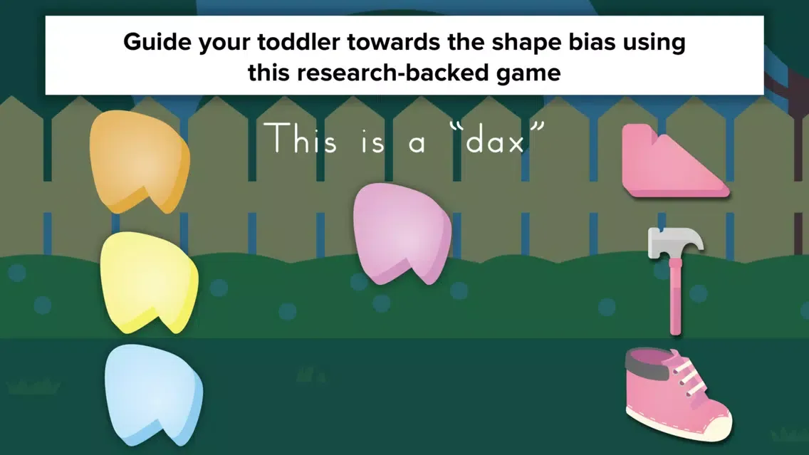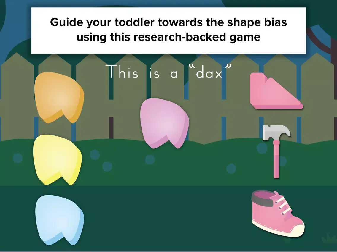 Help your toddler learn an important principle of language with this research-based game! Blicket guides children towards the shape bias: the idea that two objects with the same name tend to have the same shape, as opposed to the same color or texture. For instance, most “balls” have a characteristic spherical shape, while they vary in color and texture. Guiding 18-month-old children towards the shape bias can accelerate their vocabulary by 300% over a two month period (Smith et al., 2002).