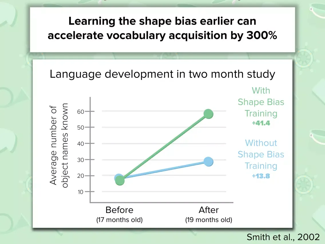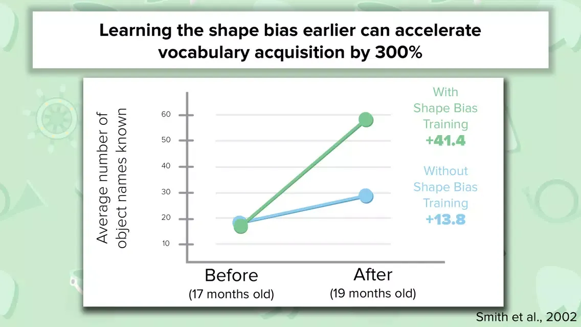 What happens if you guide children towards the shape bias earlier than they naturally acquire it? Smith et al. (2002) brought 17 month olds into the lab and helped them practice a shape matching task, where a child saw a novel object, “blicket”, and was asked to find another “blicket” that matched in shape, while ignoring distractors that matched in color or texture. After two months, the researchers found that children who received this shape training in the context of learning novel object names experienced a 300% vocabulary growth compared to children who did not receive this training. Moreover, children who are late talkers and those with Specific Language Impairment have a weaker shape bias (Jones, 2003).