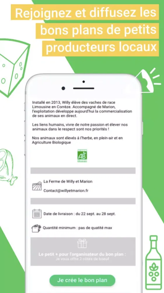 En week-end, en déplacement, sur un marché, directement à la ferme… il y a forcément un bon plan à partager. Regroupez des achats, diffusez des bons plans, commandez des produits (vins, fromages, charcuteries, huiles, ...) issus de vos meilleurs petits producteurs.