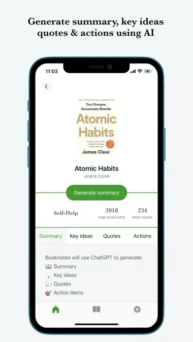 Booknotes helps to generate summaries, key ideas, quotes and actionable items using AI.