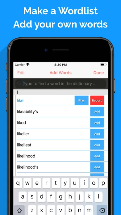 * Optionally Record your own voice for the word you want to practice. You can record just the word, or even a whole phrase to help you recognize which word to spell.