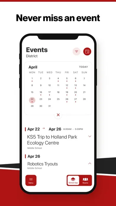 The event section shows a list of events throughout the district. Users can add an event to your calendar to share the event with friends and family with one tap.