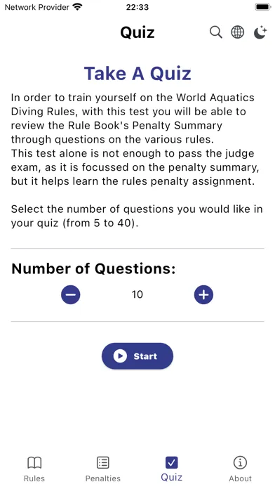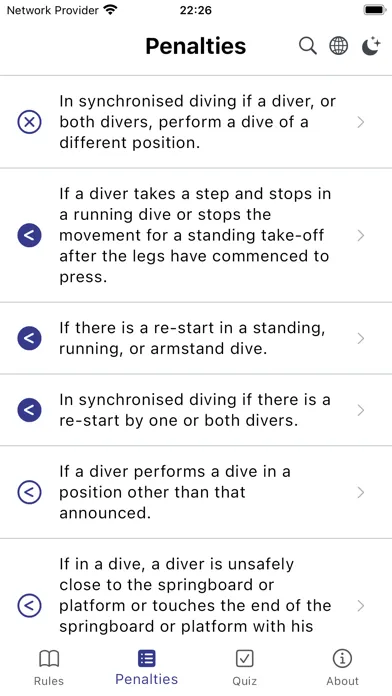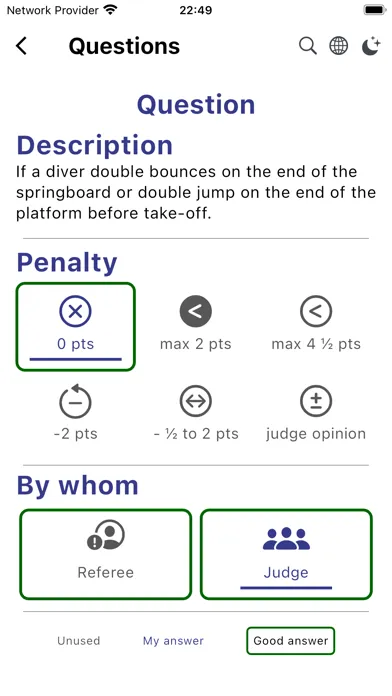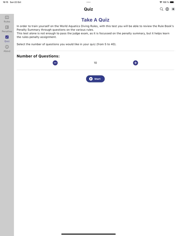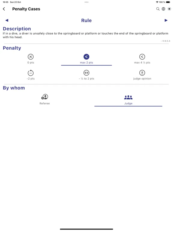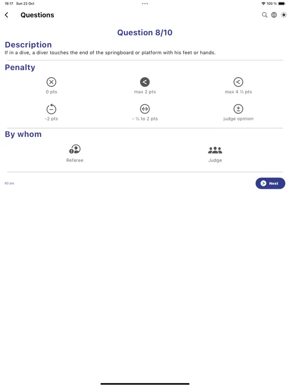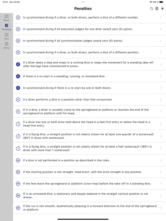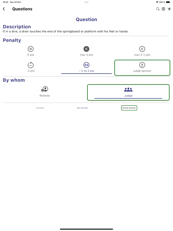 A mobile app to learn and train on the World Aquatics Diving Rules. If you are a Diving judge, a future diving judge or just a diver, this app is made for you. It holds the reference rule book and allows you to train on the penalties associated to the Referee or the Execution or Synchro Judges.
