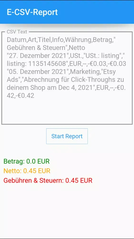 E-CSV-Report gives you instantly an overview about your sales activities on Etsy like revenue, tax and fees, based on csv files which can be created in your backend at any time. CSV data can be easily edited inside the app to meet the needed time frame or any other criteria.