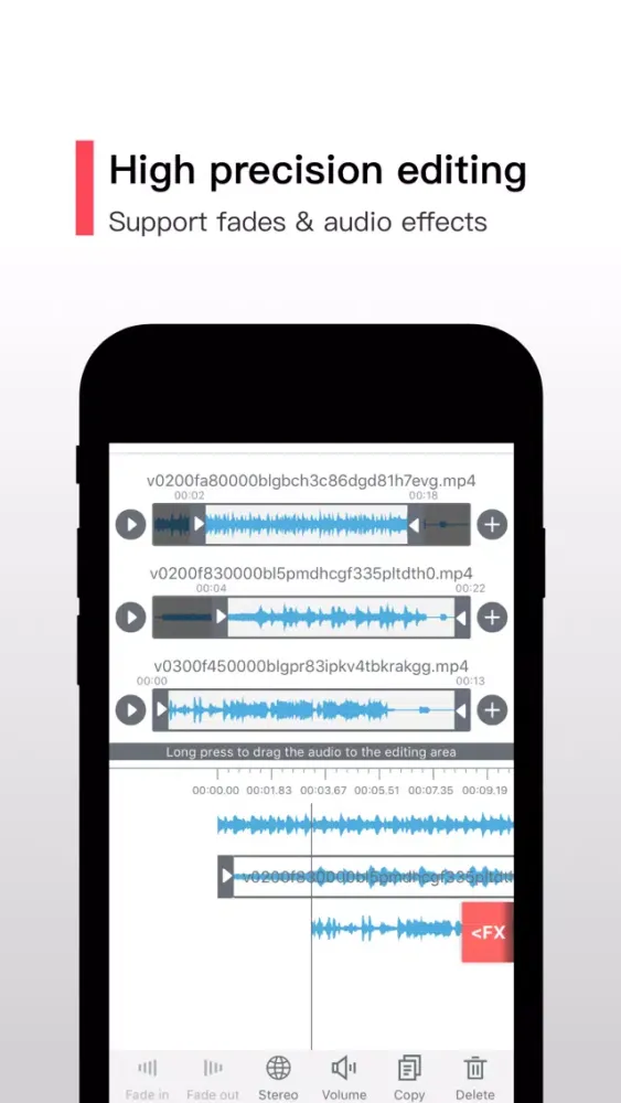 -- Easily set the left and right channels, or stereo, adjust the start and end of the music, fade in and out, and adjust the volume.