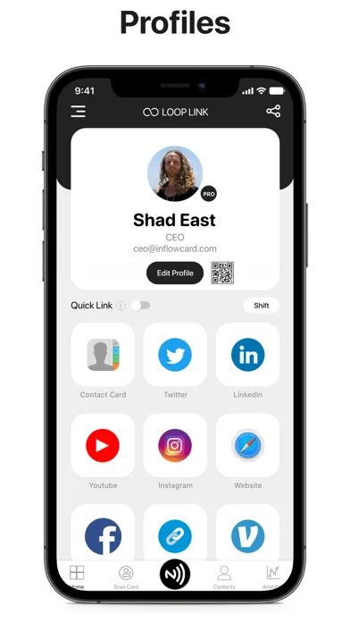 LoopLink is the fastest way to share your social media and contact information! By tapping your Inflow card or sticker to someone else's phone you can instantly share your entire contact profile with anyone you meet. They don't need an app or an Inflow card or sticker to receive your info.