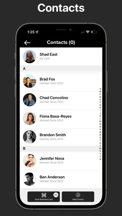 The Contacts Page automatically keeps a history of everyone that has linked with you! Met someone last weekend? Access their profile whenever you want and never lose another connection.