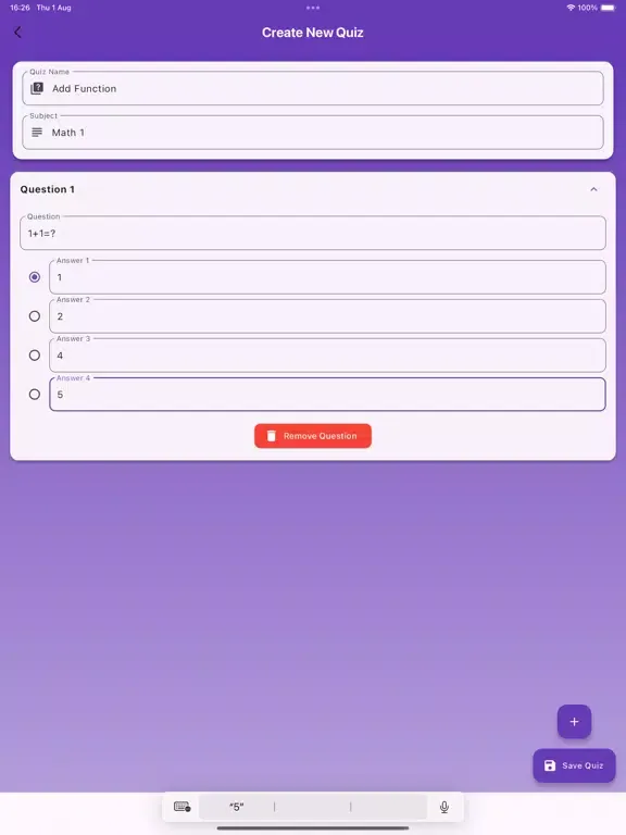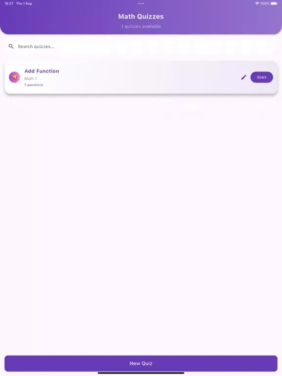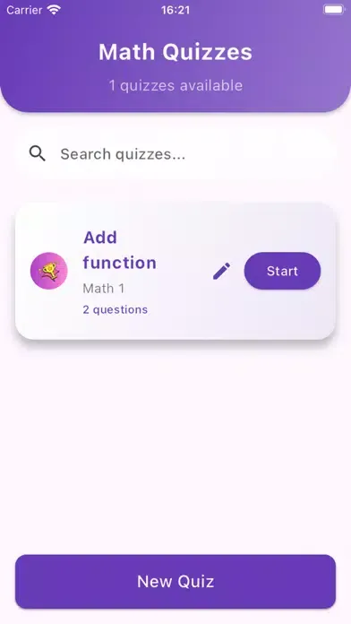 MyMath Quizzes allows users to create and manage custom quizzes with ease. Users can add new quizzes by specifying a name and subject, and then populate each quiz with questions and multiple-choice answers, identifying the correct answer for each question. The app provides a searchable list of quizzes and an intuitive interface for taking quizzes, displaying one question at a time and tracking the user's progress. Additional features include the ability to edit existing quizzes and merge different quiz lists, making it a versatile tool for anyone looking to enhance their learning experience.