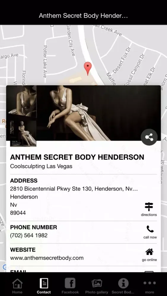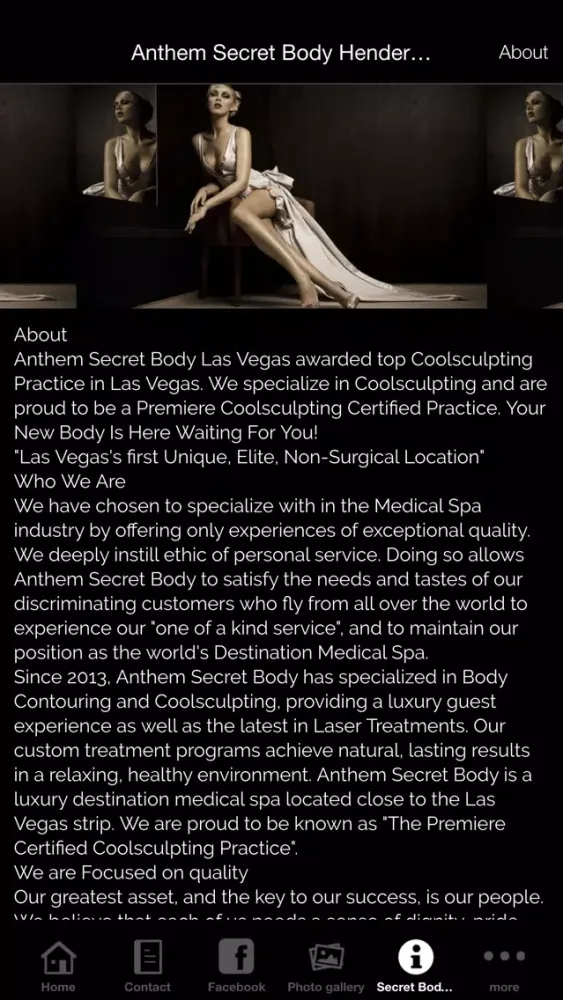 Welcome to Anthem Secret Body reviews in Henderson, Nevada. Anthem Secret Body is located close to the Las Vegas strip. Anthem Secret Body reviews specializes in Coolsculpting by Zeltiq. We will Freeze your Fat in 1 hour with no downtime, no needles, and no surgery! In addition to offering Coolsculpting we also offer: Velashape, Cellulite Treatments, Painless Soprano Laser Hair Removal, Body Contouring, Chemical Peels, Fraxel, Tattoo Removal, Refirme Skin Tightening, Skin Rejuvenation, and much more. At Anthem Secret Body we believe Looking your best makes you feel better. Visit us today to Transform Your Body. Our Philosophy is simple At Anthem Secret Body: Provide only the best laser technology to our clients in a relaxing supportive environment. Your skin is our specialty if you are a Henderson or Las Vegas resident you will be pleased with the service we offer. You will discover a unique concept of the skin and the body with undeniable results. Our highly-trained professionals will give you realistic obtainable goals with real results. Imagine technology that can change the way you feel about your skin and body. Imagine painless hair removal. Call today for a free no obligation consultation with one of our skin care professionals. We offer treatments with no down time and provide you with the newest technology so you are happy with your results. We offer Free skin and body analysis's with advanced technology from Visia which provides meaningful skin evaluations, on-screen and printed reports, and tracks treatment progress. A Younger you is possible! We are open Monday thru Saturday from 8am to 8pm. Specializing in Coolsculpting we are clearly a destination location if you want Coolsculpting while you are visiting Las Vegas.