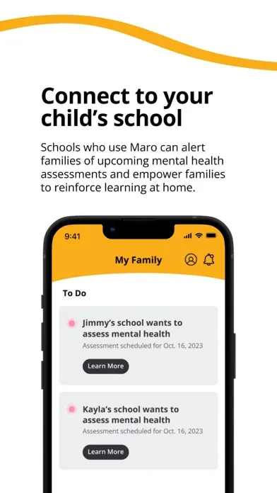 Connect to Your Child's School: Schools who use Maro can alert families of upcoming mental health assessments and empower families to reinforce learning at home.