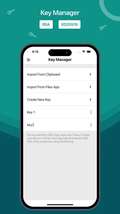• Private key files can now be directly imported in multiple formats (RSA, DSA, Putty) using iTunes sharing from other apps and Clipboard