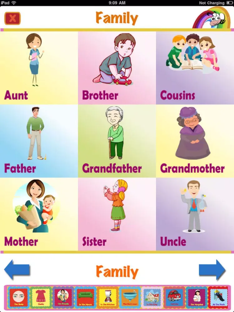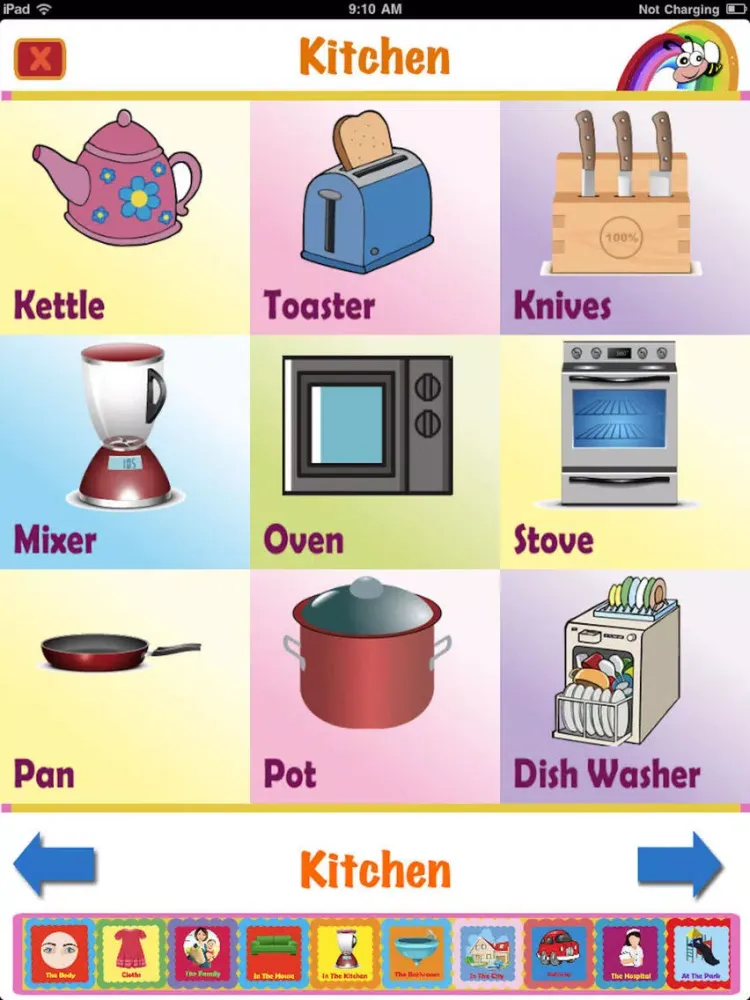 Categories include:Body, Family, Kitchen, In the house, Bathroom, Supermarket, In the city, In the park, Action Words, Tools, Animals, Party Time and many many more