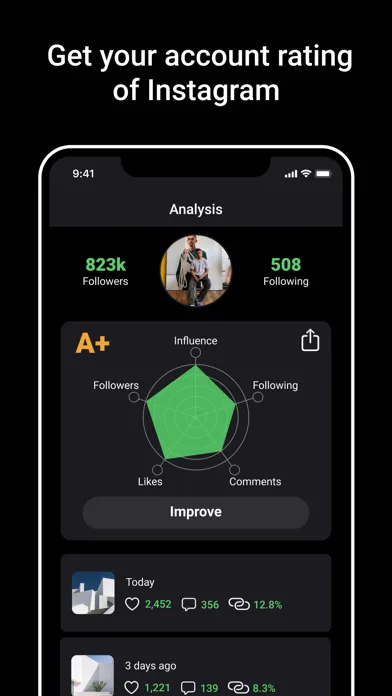 - Get your IG account rating (A+ ~ E-) and optimization strategies.