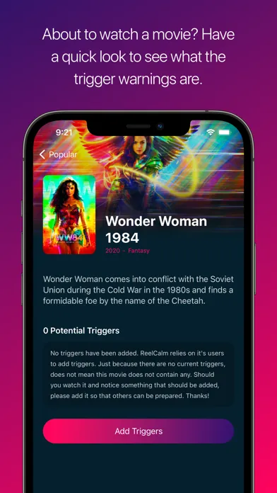 ReelCalm is a community based app designed to identify potentially harmful triggers in movies, so that those with past trauma or anxiety can watch in peace.