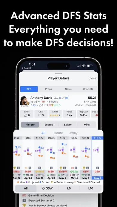 · Touch player's name to see an advanced graph of recent performance vs. our projections